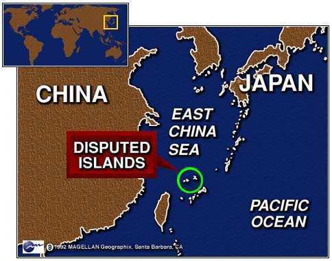 ![]() La ubicación del archipiélago Senkaku/ Diaoyu en el Mar de China Oriental (o Huatung)