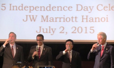 ![]() El ex presidente de Estados Unidos, Bill Clinton y el vicepremier vietnamita, Pham Binh Minh en la celebración del Día de la Independencia de Estados Unidos y los 20 años de normalización de las relaciones diplomáticas entre los dos países