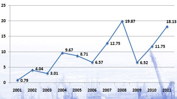 Evolucion de la tasa de inflación en Vietnam desde 2001 hasta 2011 (%)