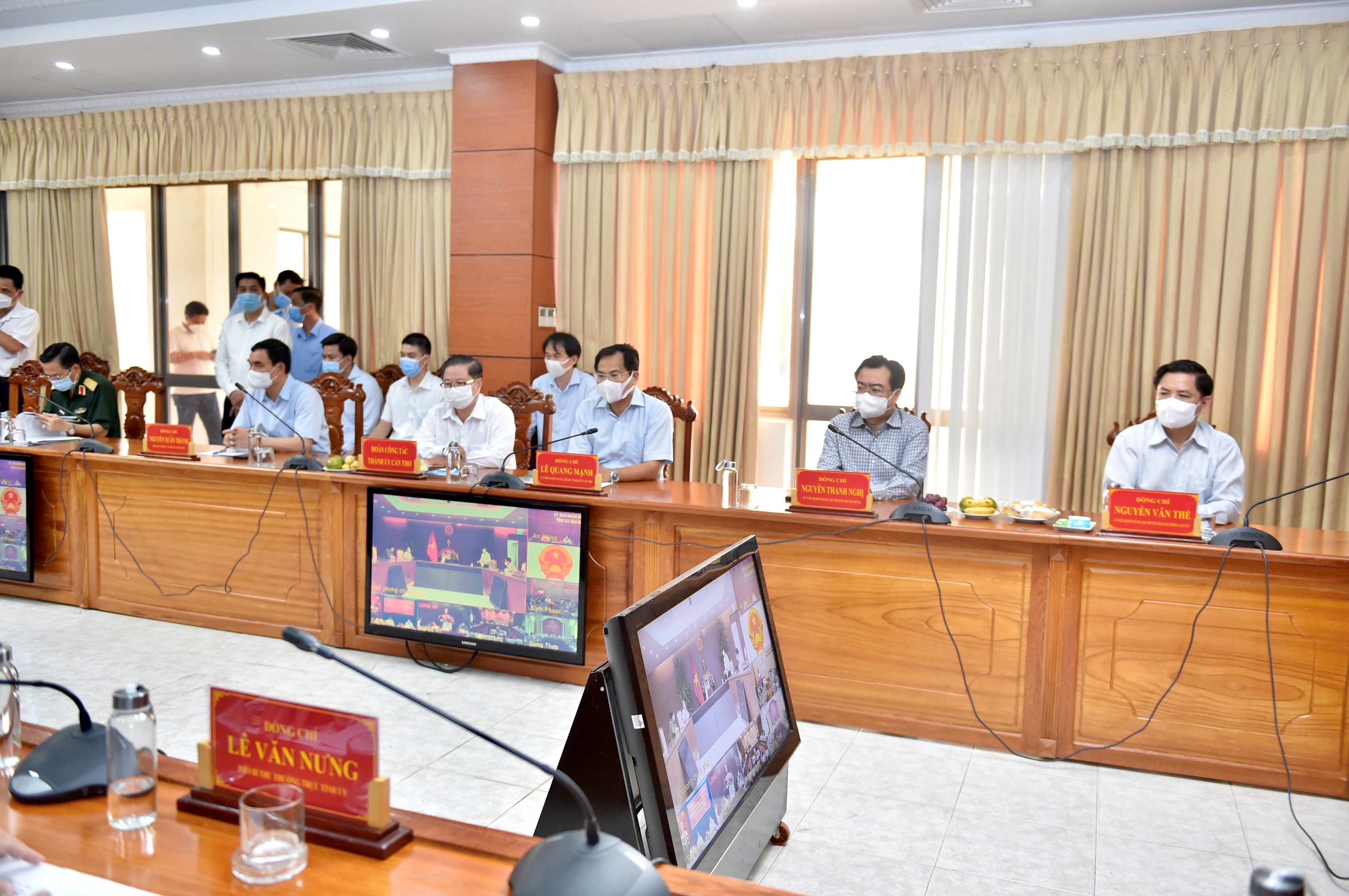 El primer ministro Pham Minh Chinh preside la reunión urgente sobre la prevención y el control del covid-19 desde la provincia meridional de An Giang. (Foto: VGP) |