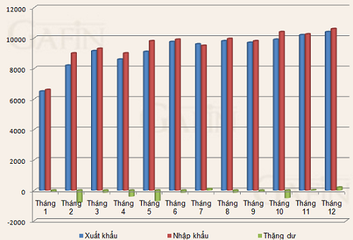 y superávit comercial (verde) de Vietnam en 2012