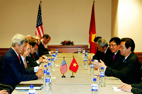 El primer ministro de Vietnam, Nguyen Tan Dung (d) recibe al secretario de Estado