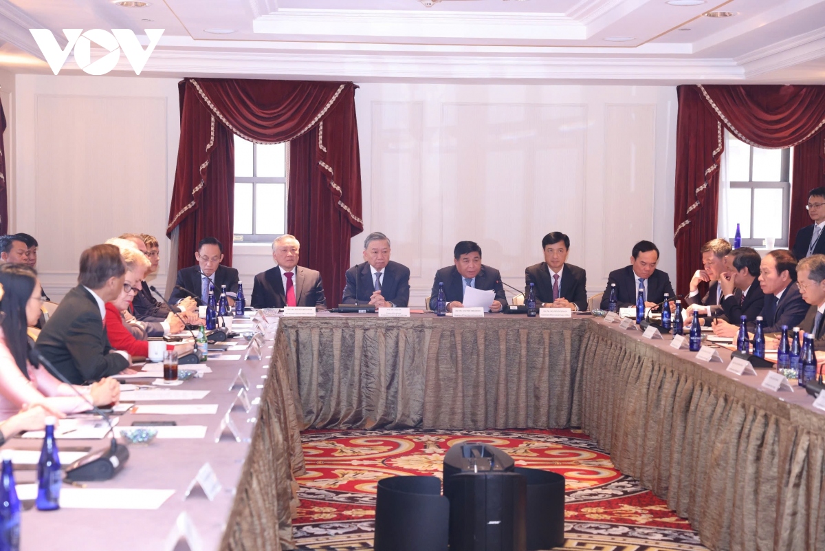 Dirigentes vietnamitas durante un taller sobre el fortalecimiento de la cooperación entre Vietnam y Estados Unidos en el desarrollo de las industrias de semiconductores y de inteligencia artificial. (Foto: VOV) |