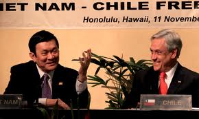 Hasta el momento, Vietnam y Chile han firmado cerca de 20 convenios de cooperación en sectores político-diplomático, económico-comercial, científico-tecnológico, cultural y turístico… El intercambio comercial entre los dos países experimenta un fuerte aumento, de 18 millones de dólares en 2000 a unos 500 millones de dólares en 2011. En 2007, Chile reconoció oficialmente la economía mercantil de Vietnam. Especialmente, el 11 de noviembre de 2011, ambas partes firmaron el Acuerdo de Libre Comercio luego de 8 rondas de negociación durante 3 años. El convenio favorecerá la importación por parte vietnamita de carne de cerdo, frutas y zumos de Chile con preferencias arancelarias, así como la venta al mercado chileno de productos de Vietnam como calzados, arroz, confecciones textiles y café, con bajo impuesto de exportación.