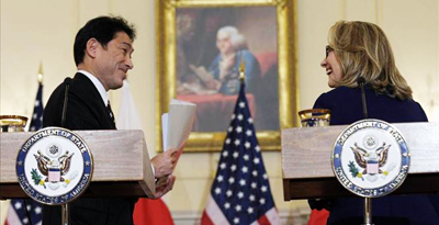 El ministro de Asuntos Exteriores de Japón y la ex secretaria norteamericana de Estado, Hillary Clinton en la reunión de cancilleres el 18 de enero de 2013