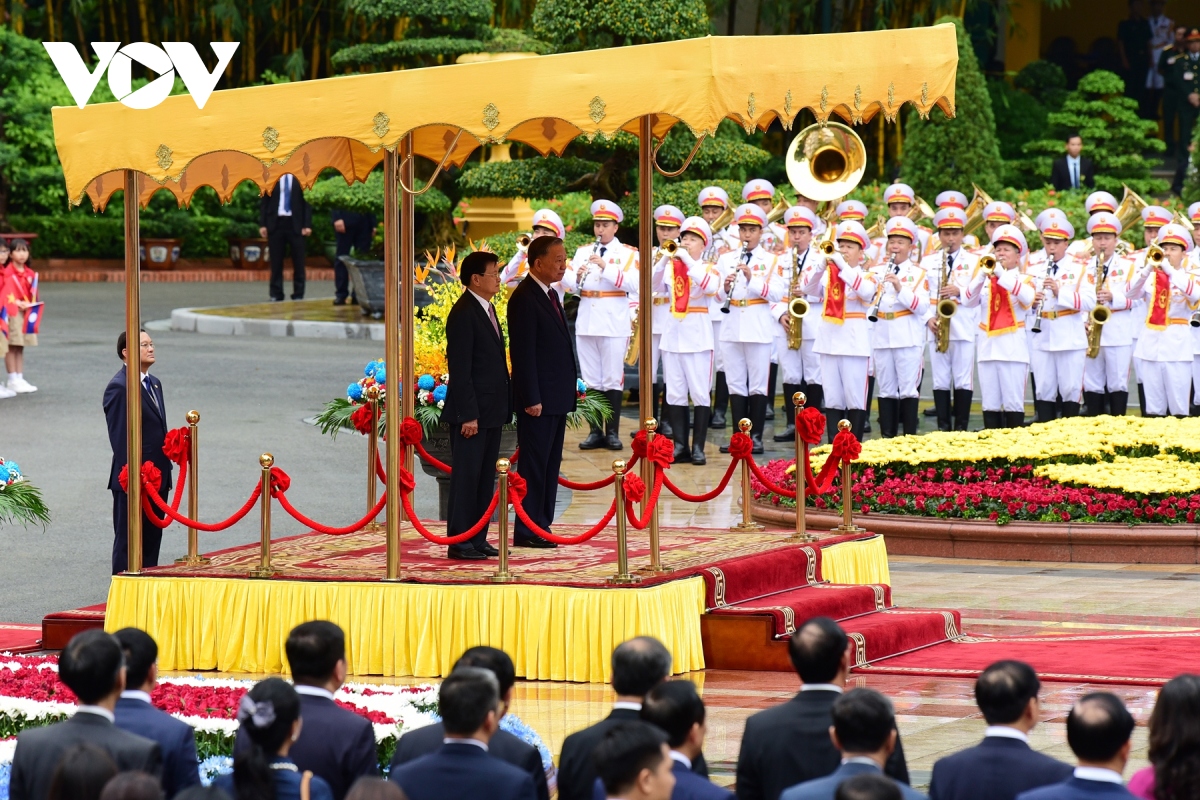 El secretario general del Partido Comunista y presidente, To Lam (d) preside una ceremonia de bienvenida a su homólogo laosiano, Thongloun Sisoulith, en Hanói. |