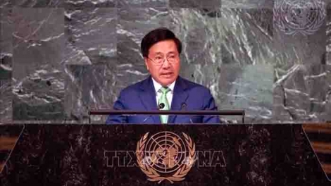 (VOVWORLD) - El viceprimer ministro permanente Pham Binh Minh asistió y pronunció el 24 de septiembre un discurso en la sesión de debate general, en el marco del septuagésimo séptimo período de sesiones de la Asamblea General de las Naciones Unidas en Nueva York, Estados Unidos. En la reunión, Binh Minh reafirmó la posición del Gobierno vietnamita que prioriza la cooperación multilateral, llamando al mundo a cooperar con espíritu de solidaridad para superar juntos los desafíos en aras de la paz y el desarrollo sostenible.
