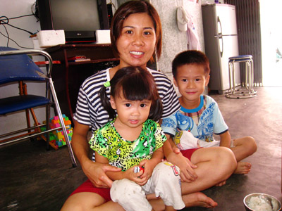 Hoàng Thị Mai, esposa del marino Hoàng Duy Chinh, con sus dos hijos