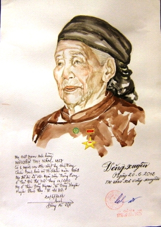Pham Thi Thanh, una mujer heroica vietnamita, ahora vive con su hija y nietos en un pequeño apartamento en Ciudad Ho Chi Minh. Ella perdió a su marido y a su hijo durante la guerra. Dijo que su retrato realizado por Dang Ai Viet está colgado con orgullo en la pared. Bajo los ojos de la Madre Heroína Pham Thi Thanh, es una persona abnegada, cercana y querida, compartiendo: “Ella dibuja bien. Esa soy yo en la imagen. Cuando Dang Ai Viet vino a traerme la obra, yo estaba feliz y emocionada porque muchas madres vietnamitas que viven en zonas remotas no han sido tan afortunadas. Espero que Ai Viet pueda ejecutar más lienzos de cada una de ellas.”