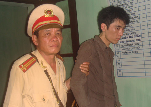 El Coronel Duc Doan está llevando al bandido en la sede de la policía