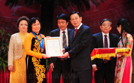 La profesora destacada Nguyen Thi Hien en el acto de entrega del título