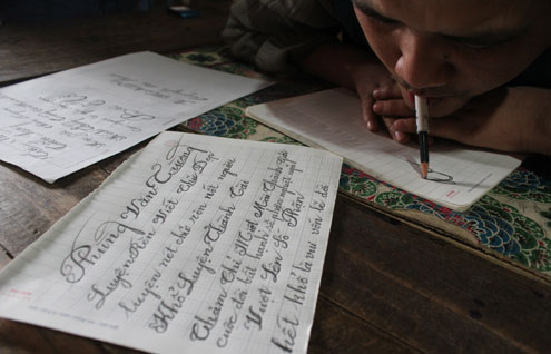 (VOVworld)-El joven Phung Van Truong en la aldea Nhan Ly, comuna Nam Phuong Tien, distrito Chuong My, Hanoi, es un joven desafortunado con manos y pies reducidos e inutilizables, y debe desplazarse en silla de ruedas. Sin embargo, gracias a un entrenamiento persistente, puede escribir con la boca y convertirse en maestro de numerosos niños locales.