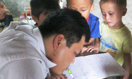 No solo escribir, sino que su caligrafía es bastante bonita. Después, empezó a ayudar a sus sobrinos y niños del vecindario a escribir y estudiar otras asignaturas. Actualmente su clase gratuita tiene l0 alumnos del primer al quinto grados. El maestro Truong sabe la forma de enseñar para que los escolares puedan asimilar fácilmente los conocimientos. Hoang Van Toan, alumno del cuarto grado, dijo: “Quiero mucho al Tío Truong y llego a su casa para aprender matemática, escritura y lectura. Solo llevo más de un mes de estudio, pero progreso mucho. Puedo hacer los ejercicios de matemática e idioma vietnamita en la clase. Veo que la forma de instrucción del tío Truong es fácil de asimilar, por eso, puedo avanzar en el estudio. Me esforzaré por aprender mucho.”