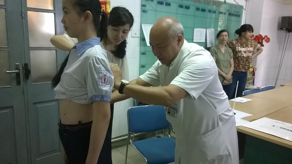 El doctor Nguyen Van Thach está examinando la salud de una alumna