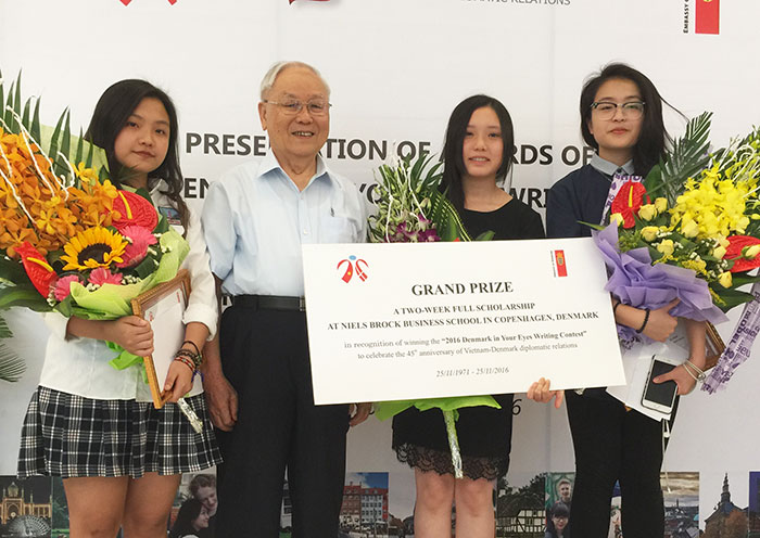 ![]() El profesor Nguyen Trong Vinh felicita a sus estudiantes ganadoras del concurso de escritura en inglés "Danesa en sus ojos"
