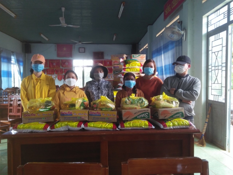 Nong Thi Lanh (segunda, a la derecha) entrega paquetes de artículos de primera necesidad a familias necesitadas en su aldea. (Foto: VOV) |