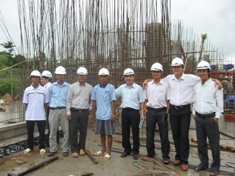 El profesor Tran Dinh Hoa (4a desde la dch.) visita la obra de regadío Xa No,