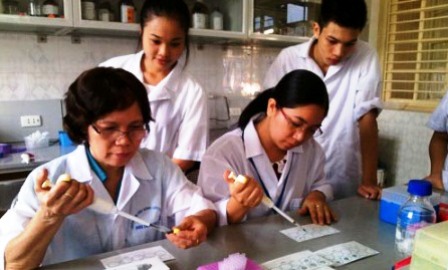 ![]() Nguyen Thi Kim Lan, (i) y su colegas jóvenes en un laboratorio de la Universidad de Agroforestería de Thai Nguyen