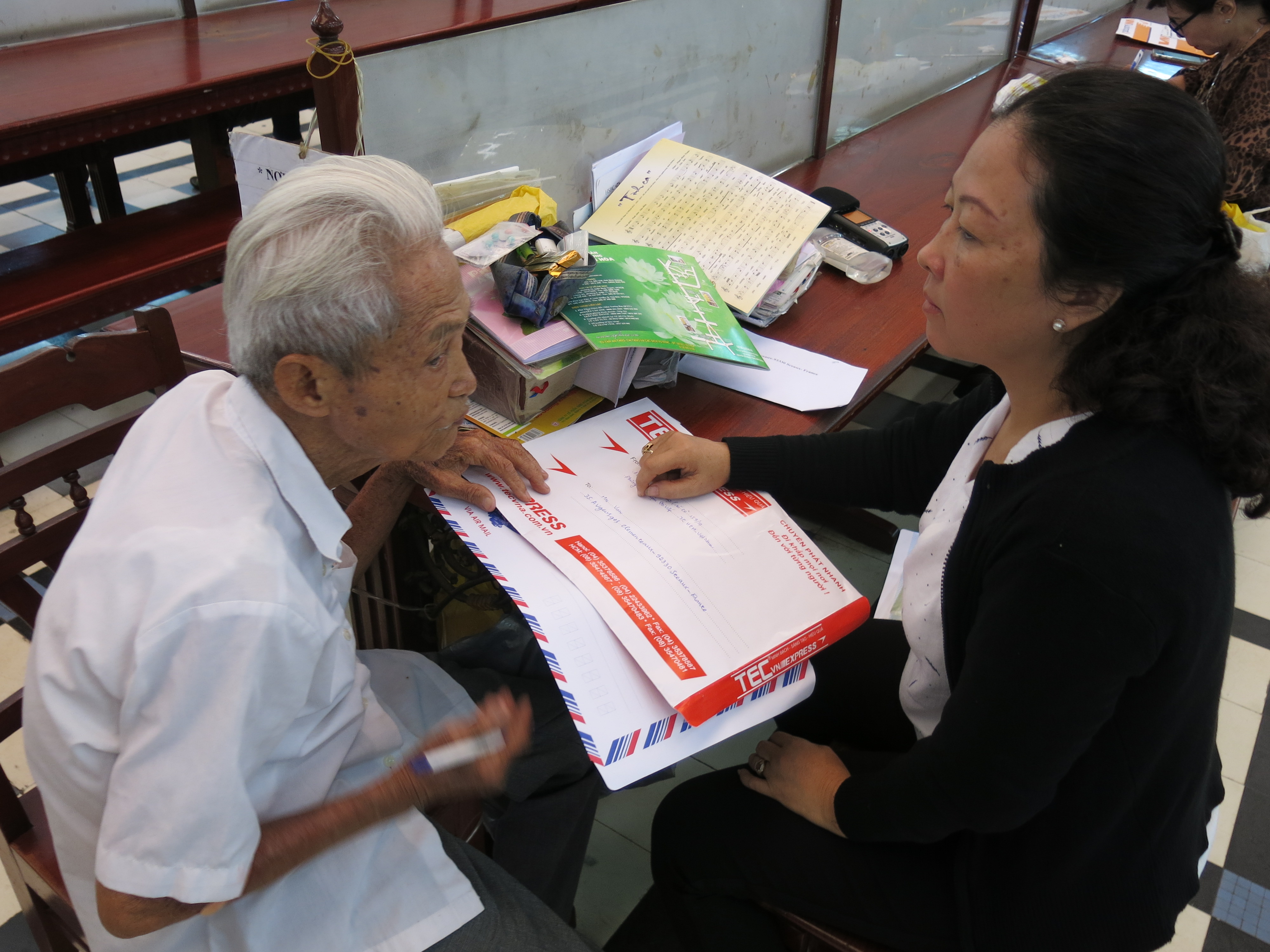 Esta conversación se produjo entre Duong Van Ngo y Ho Thi Hong, una residente del distrito 8, quien llegó temprano a la Oficina Municipal para pedirle que le traduzca la dirección de un envío que recibió recientemente. Thi Hong, agregó lo siguiente: “La primera vez que utilicé los servicios del señor Ngo tenía 14 o 15 años. Ahora tengo 50 años y aún sigo viviendo. Lleva en este trabajo desde hace mucho tiempo”.