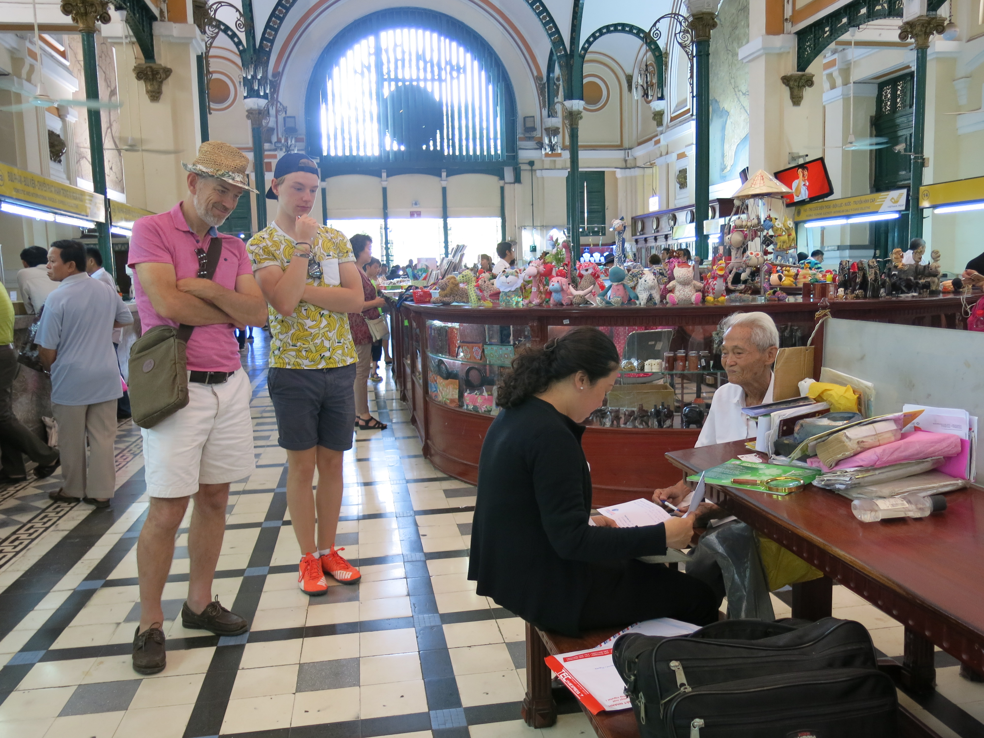 Nacido en 1930, Duong Van Ngo ha trabajado como escritor epistolar público durante los 27 años. Todos los días se encuentra sentado al final de una larga mesa de madera, al lado del letrero “Información y Asistencia por escrito”. Está dispuesto a traducir cartas del vietnamita al inglés o francés y viceversa. También ayuda a los clientes a escribir direcciones de los destinatarios en el extranjero.