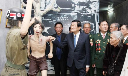 El presidente vietnamita Truong Tan Sang (c) y ex presos de