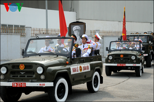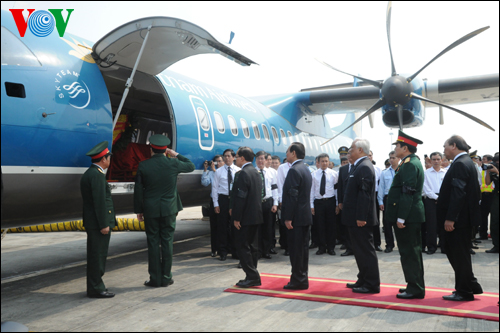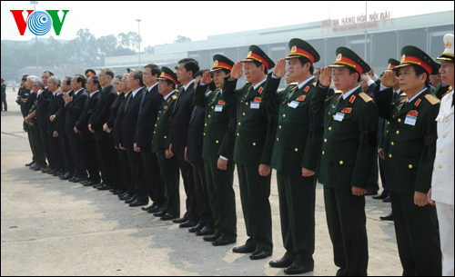 (VOVworld) - A las 10 y 30 horas de este domingo, el avión especial ATR72 con los despojos del general Vo Nguyen Giap a bordo despegó del aeropuerto de Noi Bai, en Hanoi y aterrizó en el aeropuerto de Dong Hơi, en Quang Binh casi a las 12 horas del mediodía, de donde el féretro del general fue trasladado a Vung Chua, para el sepelio que tuvo lugar en la misma tarde.