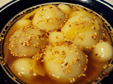 El "bánh trôi Tàu" (bola de masa hervida rellenada de terrón de azúcar),