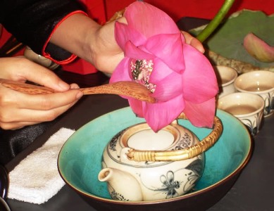 ![]() Después de calentar el agua y preparar la tetera, depositan unas cucharadas del té perfumado de loto en el interior de la tetera