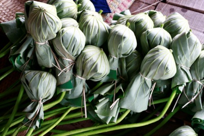 ![]() Fanáticos del té selecionan las flores recién florecidas, dejar algunas pizcas del té en el interior, entonces, y luego atarlos con hilo y ultilizar su hoja para envolverlos con el fin de evitar la lluvia