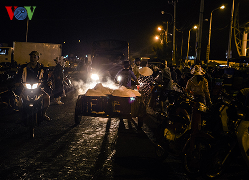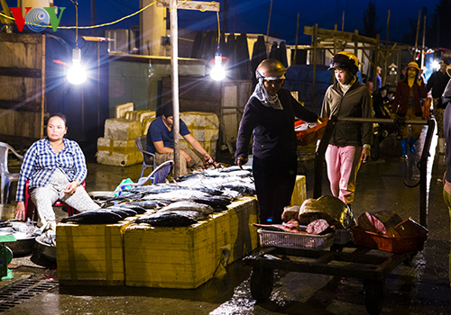 Al amanecer, el puerto pesquero Quang se pone bullicioso con motocicletas que