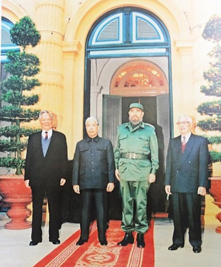 ![]() En diciembre de 1995, el líder cubano inició su segunda visita a Vietnam. Tomó una foto de recuerdo con el entonces secretario general del PCV, Do Muoi, el president Le Duc Anh y el primer ministro Vo Van Ket |