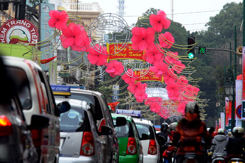 | Adornos con forma de flor de melocotón en la calle de Trang Tien |
