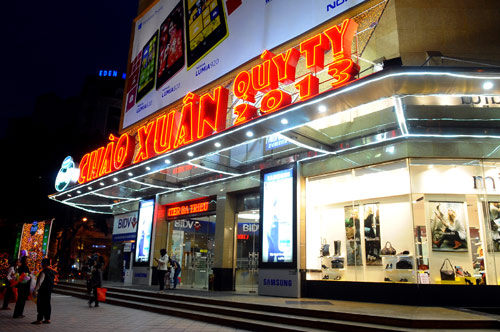 | Tiendas decoradas con luces y linternas de papel en el centro comercio Vincom |