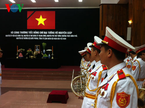 (VOVworld) – El Comité Central del Partido Comunista de Vietnam, la Asamblea Nacional, el el Gobierno y el Frente de la Patria Nacional organizan en los días 12 y 13 de octubre un funeral de nivel estatal para el general Vo Nguyen Giap, en la Casa Funeraria Nacional en la calle de Tran Thanh Tong en Hanoi. Desde la madrugada, miles de personas provenientes de todo el país han hecho una cola larga para poder depositar inciensos y flores en memoria al general de su corazón. Mientras tanto, en otras ciudades y provincias de la nación, se efectúan similares ceremonias para honrar al legendario Giap.