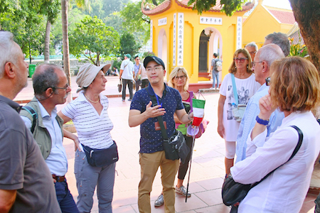 ![]() Un guía está introduciendo sobre la pagoda a turistas extranjeros |