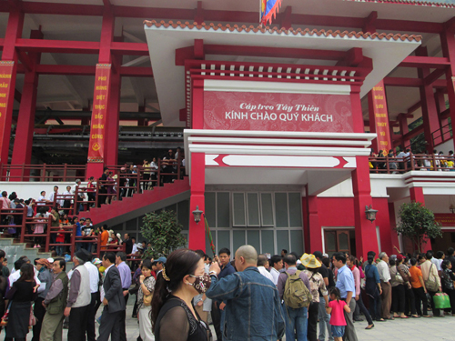 Los turistas hacen larga cola para abordar el teleférico rumbo al Templo Alto de culto |
