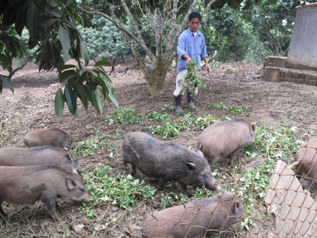 La administración de la comarca orientó también a los agricultores a cambiar la estructura de plantas y animales de corral acorde a la condición local. La zona de Mong Cai es famosa por la carne de cerdo, muy buena y fácil de consumir. Los autóctonos invirtieron audazmente en el fomento de esta raza porcina y la cruzaron con los cerdos silvestres de Lang Son para lograr un alto valor económico. La familia de Ho Thi Vay fue elegida como piloto. Al principio, crió l0 cerdos silvestres y después aumentó a 30. Cuando este modelo obtuvo alta eficiencia económica, ella compartió experiencias y ayudó a los vecinos a enriquecerse con la cría. Vay dio a conocer: “Invertimos un total de 200 millones de dong en la ganadería, incluyendo la construcción de una alberca de biogás con 30 millones, un establo, 50 millones, y en la compra de pies de cría, 30 millones. Después de un año y medio o 2 años, vendimos estos animales a un precio de 200 a 350 mil dong por kilogramo. La cría nos trajo un ingreso de l00 millones de dong al año. Además, producimos tartas de soya y destilamos aguardientes para vender.”