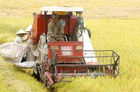 Campesinos de Dong Thap cosechando arroz en un campo de colaboración