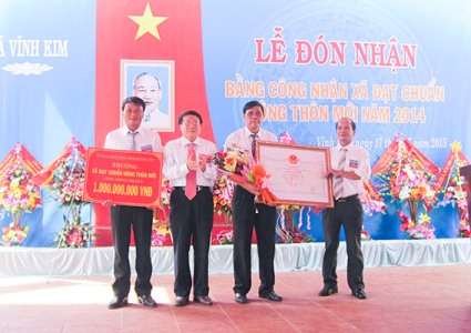 La comuna Vinh Kim, del distrito Vinh Linh, Quang Tri, recibe el diploma de reconocimiento por sobrecumplir las normas del nuevo campo