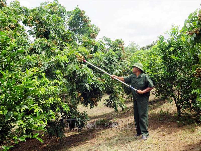 Un poblador de la aldea de Chieng Khuong cuida el huerto de longan. (Foto: VNA) |