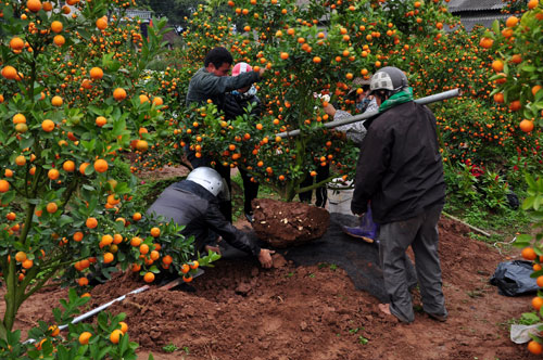 En estos días, los horticultores de Phu Van están dando el toque final a las flores para el Tet. Tienen mucha faena debido a que este año es probable que los clientes quieran comprar flores por adelantado, lo que se adapta a sus negocios, como explica a continuación Tran Van Quang, uno de los cultivadores: “Tengo 7.200 metros cuadrados de tierras cultivables particularmente para los naranjos y melocotoneros. Hasta el momento, todo está comprado. No tengo que ir a los mercados sino que la gente viene aquí y compra en mi propio jardín lo que quiere. El precio por un árbol de melocotón ronda entre los 300 y 500 mil dongs (entre 13,2 y 22 dólares), mientras que por un naranjo, entre los 200 y 300 mil (entre 8,8 y 13,2 dólares). Por un bonsái obtengo una ganancia de al menos un millón, aunque a veces puede llegar a más de 10 millones de dongs (441 dólares). El año pasado logré una facturación de 700 millones de dongs (30 mil 870 dólares) por la cosecha del Tet.”