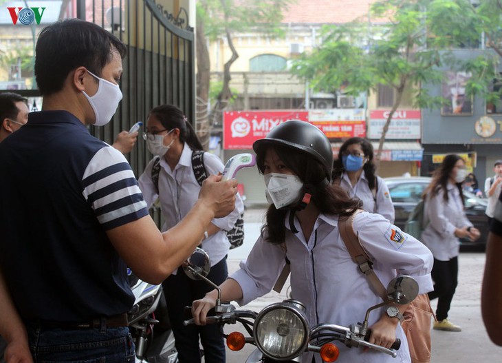 Los estudiantes de la escuela secundaria Phan Dinh Phung (distrito de Ba Dinh) miden su temperatura corporal antes de entrar a la escuela. |
