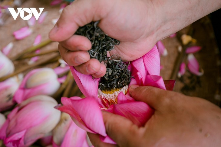 Hay dos formas de dar sabor al té, una rápida y otra larga y tradicional. La forma rápida es poner el té directamente dentro de una flor de loto. El artesano envuelve la flor con una hoja y continúa plantándola en agua durante unas horas. Luego corta la flor, la mete en una bolsa de vacío y la guarda en el congelador. Este tipo de té se vende a 80.000 dongs (3 euros) por flor, el equivalente al contenido de una tetera. |