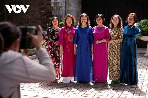 Durante el otoño, tomar fotografías vistiendo con Ao dai es un pasatiempo y una forma de expresar orgullo por el patrimonio cultural nacional. |