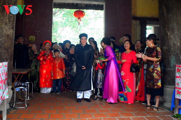 | El festival reproduce el momento en que el genio tutelar de Tam Giang iba a la pagoda en busca de su madre y su esposa, a quienes luego traería de vuelta a la casa comunal para compartir las ofrendas. |