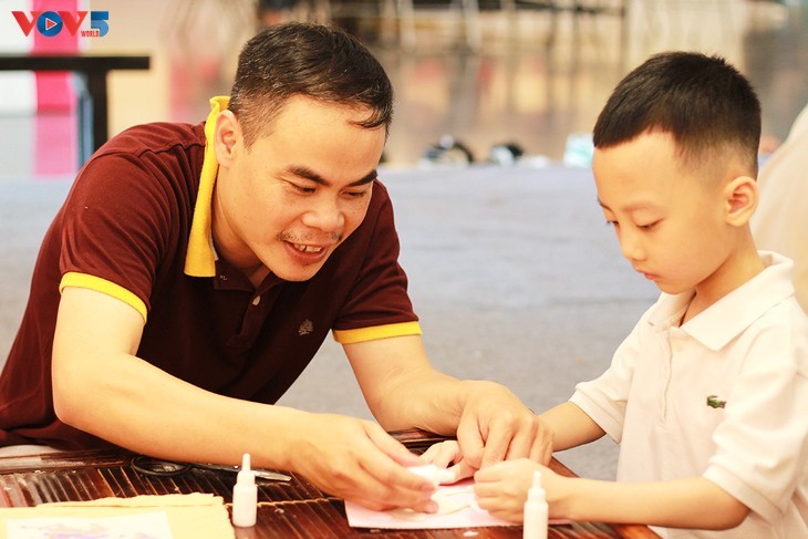 Le Viet Cuong ayuda a un niño a hacer una pintura en seda. |