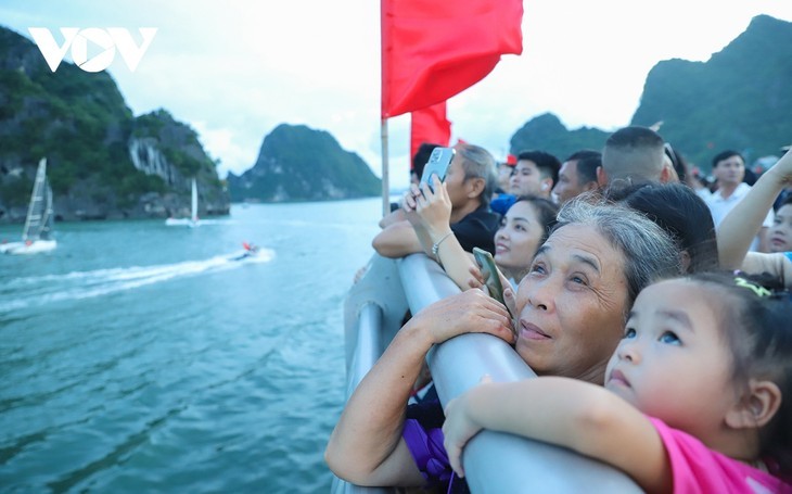 A partir de las 5 de la tarde, más de 50 vehículos acuáticos y aéreos se instalan en el “escenario”, que es el área acuática frente al Parque de Flores de Ha Long. El telón de fondo son las islas rocosas de la bahía de Ha Long, lo que hace que los espectáculos sean únicos. |
