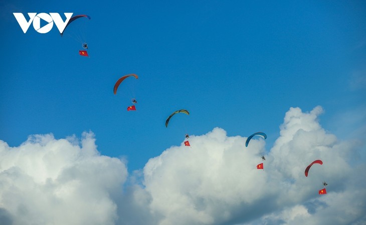 Parapentes llevando la bandera nacional se balancean hábilmente en el cielo, hipnotizando a los espectadores. |