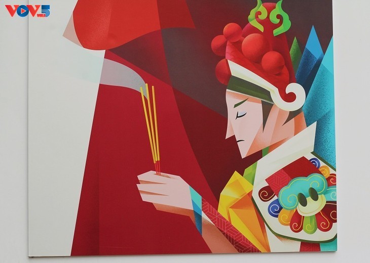 Nacido en 2000, Phuong Vy, conocido bajo el seudónimo de Vei Vei, es una de las figuras destacadas de la exposición. Graduado en la Escuela de Bellas Artes de Ciudad Ho Chi Minh en 2022, combina hábilmente su experiencia en diseño con un profundo conocimiento de la cultura folclórica. Sus obras, inspiradas en los personajes emblemáticos del Tuong (Teatro clásico) y del canto Boi, cautivan a los visitantes por su energía y sofisticación. |