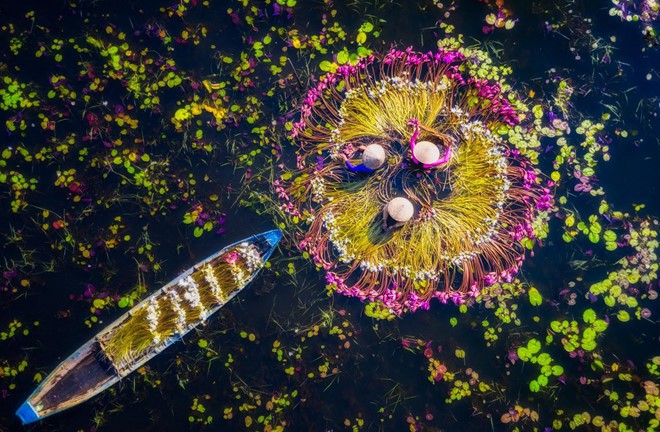 “Cosechando nenúfares” de Nguyen Tan Tuan. La foto muestra a mujeres cosechando nenúfares en campos inundados en el distrito de Mo Khoa, provincia sureña de Long An (Foto: Smithsonianmag) |